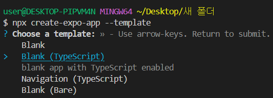 - 나는 TypeScript를 사용할 것이며 app에 아무것도 설치가 안되어 있는 상태를 선호하므로 Blank를 선택한다.