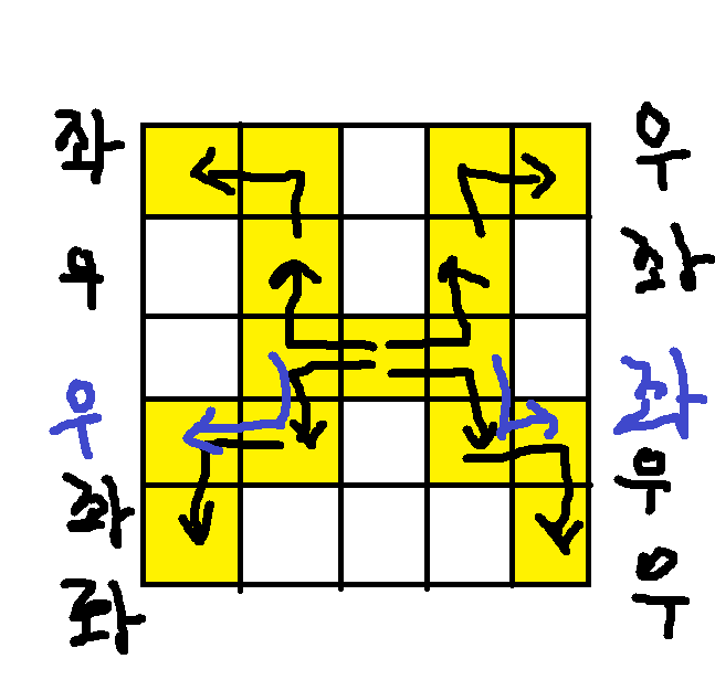 - "simple is best" 단순하게 생각해서 도형 돌리는 방법으로 나중에 다시 풀어보면 좋을 것 같다.