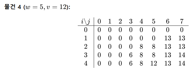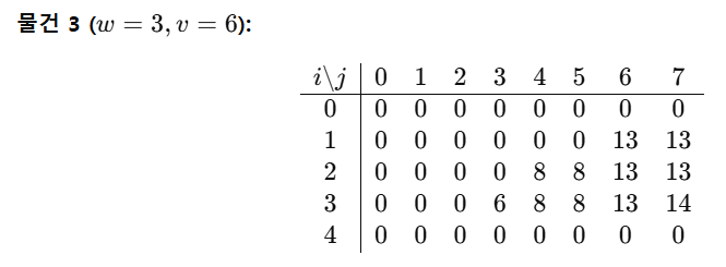 dp[i][j]dp[i][j]는 앞에서 ii번째 물건까지 고려했을 때, 배낭의 최대 무게가 jj일 때의 최대 가치를 저장.