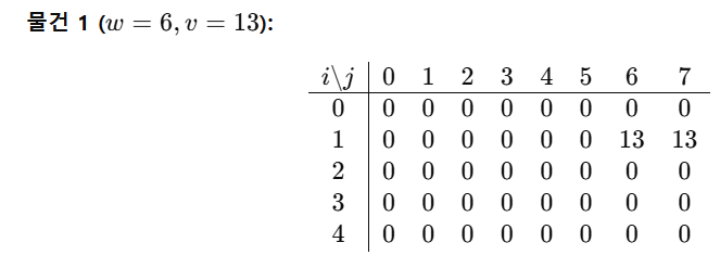 dp[i][j]dp[i][j]는 앞에서 ii번째 물건까지 고려했을 때, 배낭의 최대 무게가 jj일 때의 최대 가치를 저장.