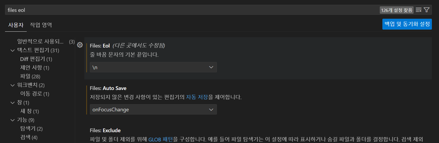 - 검색창에 Files: Eol을 입력한다.